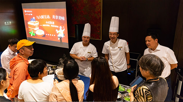 在会议中心分期开展“与大厨互动,共享美味”体验培训活动以来,深受学校师生的欢迎。刚进入新学期,中心即开设了第三期体验式培训,教授师生中式热菜的制作。此次培训,中心推出了“特色红烧肉”和“卤味凤爪”两款特色菜,现场共有18名师生参与,大厨现场烹制、讲解菜肴的制作方法步骤、主辅料及调味品的配比,师生们还与大厨进行互动,认真请教制作要领,现场气氛其乐融融。