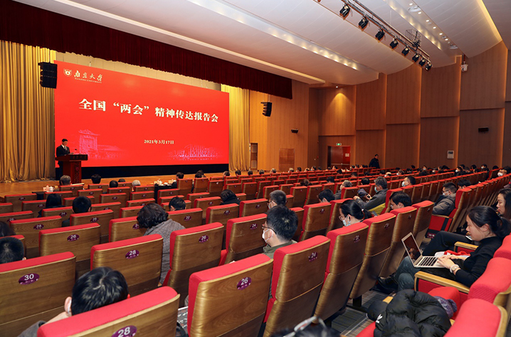 吕建以“两会精神与大学发展”为题,从时代背景与大学发展、主要精神与科教要点、南大声音与履职尽责三方面入手,介绍了人大会议情况,解读了习近平总书记在大会期间的重要讲话精神,并结合李克强总理参加江苏团审议情况和《政府工作报告》,明确了当前南大建设世界一流大学的责任使命。他指出,本次“两会”是在“两个一百年”奋斗目标的历史交汇点上召开的一次重要会议,是一次承前启后、凝聚人心、开创未来的大会。大会坚持以习近平新时代中国特色社会主义思想为指导,全面贯彻党的十九大和十九届二中、三中、四中、五中全会精神,对于鼓舞和动员全国各族人民更加紧密地团结在以习近平同志为核心的党中央周围,坚定信心、开拓进取,勠力同心做好今年经济社会发展工作,实现“十四五”时期我国发展开好局、起好步,以优异成绩庆祝建党100周年,具有十分重要的意义,希望全校师生认真学习贯彻落实“两会”精神,肩负新使命、迈向新征程,为中华民族伟大复兴贡献南大智慧和南大力量。