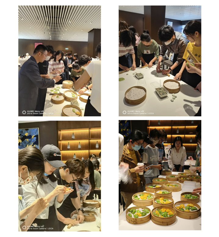 活动通过理论讲解、现场示范、实践体验等形式,让学生们对点心制作进行生动学习。期间,国际会议中心行政总厨陈超详细介绍了“冠顶饺”“眉毛饺”两款花色蒸饺的制作方法,面点厨师长现场演示了制作过程。从面团擀至成面皮,再到添入菜馅、合拢面皮、捏出饺子花边,大厨们耐心讲解,精心示范,并在学生们实际操作中手把手给予指导,让大家在寓教于乐中掌握制作技巧,提升动手能力。现场气氛轻松活跃,学生们还饶有兴趣地创意出“柳叶饺”“太阳饺”等花色。