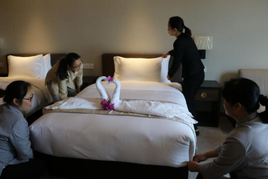 在开业后繁忙的工作下,会议中心各个部门全力以赴对待每天的工作,以房务部为例,楼层领班正常上班时间为早八点整至下午四点,因入住率不断提高,3位楼层领班赵静、骆泽娟、徐宝华每天主动加班到下午六点,有时还会到晚上八点,并放弃了很多自己的休息时间。大夜班员工吴新华本因身体原因要做一个小手术,但因客勤一直较高,吴新华只请了一天病假,第二天就又回到了自己的工作岗位。PA工作人员王成萍在打扫公共卫生间时捡到了一部手机,立即主动交至前台,丢失手机的客人找回手机后真挚的表达了感谢。虽然工作繁忙,客房部成员依然保持着乐观向上的状态,客房内会折叠天鹅,小象等装饰物,为入住的客人准备惊喜。