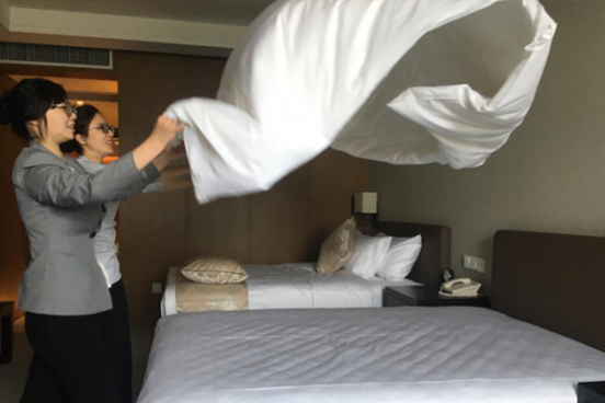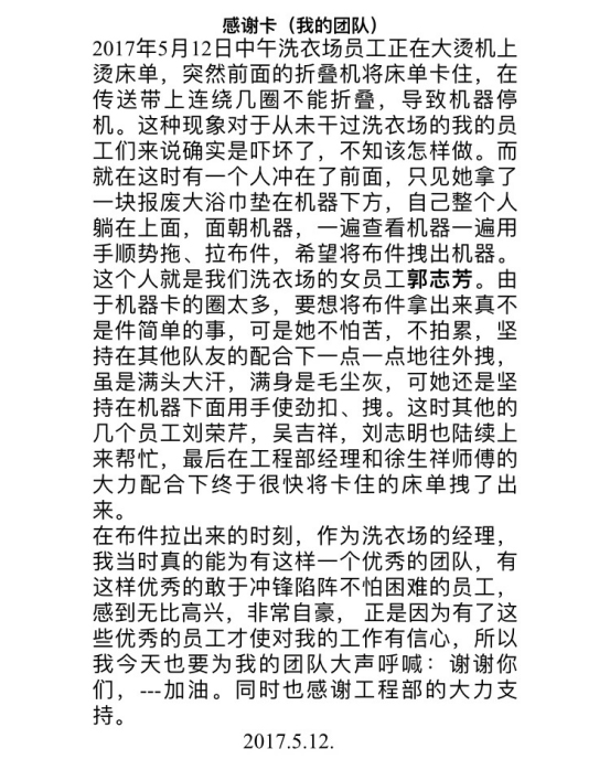 在繁重的客房入住压力下,洗衣房作为干净整洁的客房保障,每天需要清洗的床单、枕套不计其数。5月12日,在洗衣房为迎接开业做清洁工作时,折叠机将床单卡住发生突发事故,在洗衣房员工郭志芳和同事们的帮助下,床单最后被拽出了折叠机。洗衣房经理苏月英为此专门写下一篇感谢信,感谢员工冲锋陷阵不怕困难,感谢工程部在洗衣房遇到困难时伸出援手。