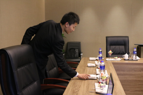 餐饮会议领班娄永喜从开业后一直负责各个会议的服务与茶歇活动,正常三点半下班的他,为了服务好每场会议,经常连续三四天加班到晚上十一点。