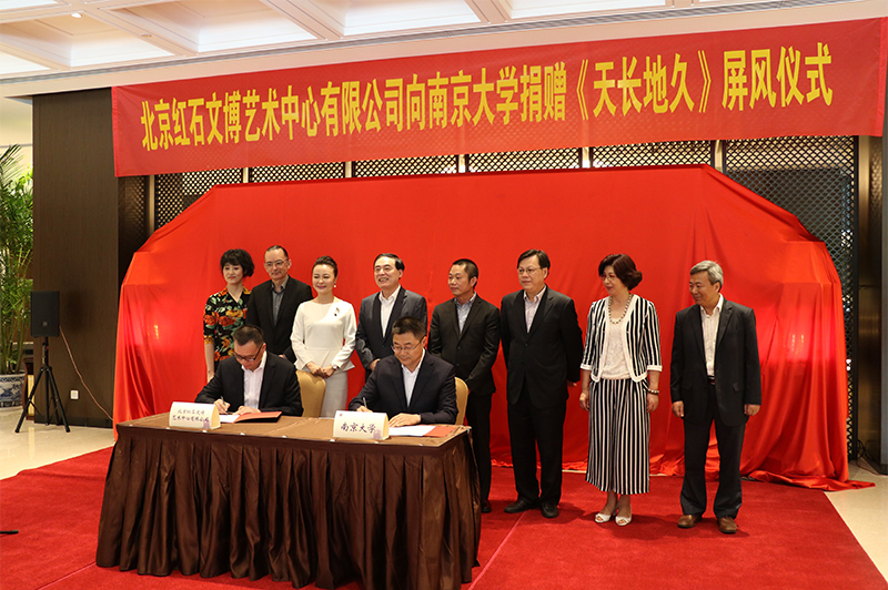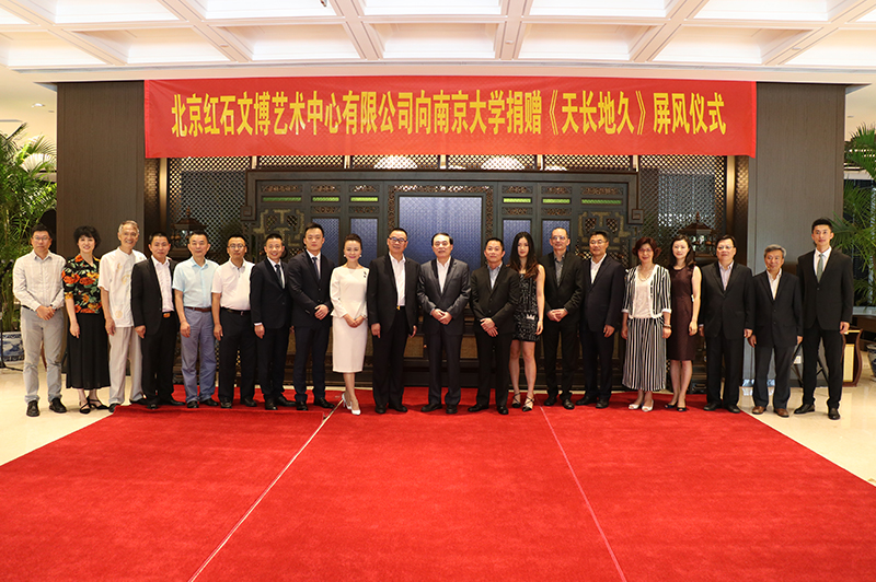 8 月10 日,北京红石文博艺术中心向南京大学捐赠柚木屏风《天长地久》仪式在南大国际会议中心如期举行。南京大学薛海林副校长与红石丰铭集团沈峰董事长签署了捐赠协议并向沈峰董事长颁发收藏证书,南京大学陈骏校长与沈峰董事长共同为屏风揭幕,并向沈峰董事长颁发感谢状。仪式由南京大学发展委员会主任张晓东主持。