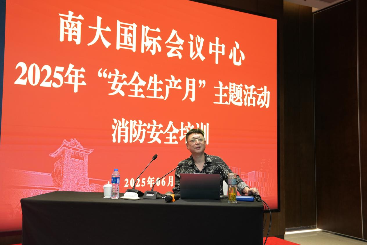 此次培训邀请江苏省消防协会专家、省文旅厅特聘消防专家张军教授开展消防安全知识授课。培训前,张军对中心各安全通道、配电间、库房、楼顶消防稳压系统、泵房、消控室等重点区域,开展“地毯式”排查,进行“把脉问诊”,并现场模拟消防系统应急响应,检验中心义务消防队员的应急反应和操作规范。授课中,张军教授从酒店火灾危险性、火灾成因剖析、火灾应急处置体系、消防日常管理措施以及如何“穿透式”开展消防安全培训等方面进行了系统讲解。结合隐患排查情况和中心日常安全管理工作,他重点讲述了电器短路、厨房油锅起火、消防维护不当等常见原因引发火灾的防范措施,以及初期火灾扑救、疏散逃生、预防二次伤害、报警流程等内容。张军通过近年来各地发生的有影响力的火灾视频和亲历火灾救援的实际案例,以理论结合实际的形式和生动风趣的宣讲,有效提升了全员消防安全素养和应急能力,为“安全生产月”系列活动的深入开展奠定了坚实基础。