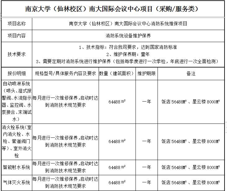 本次招标项目内容:南大国际会议中心所需消防维保类,采购的消防维保品种及要求见附件。